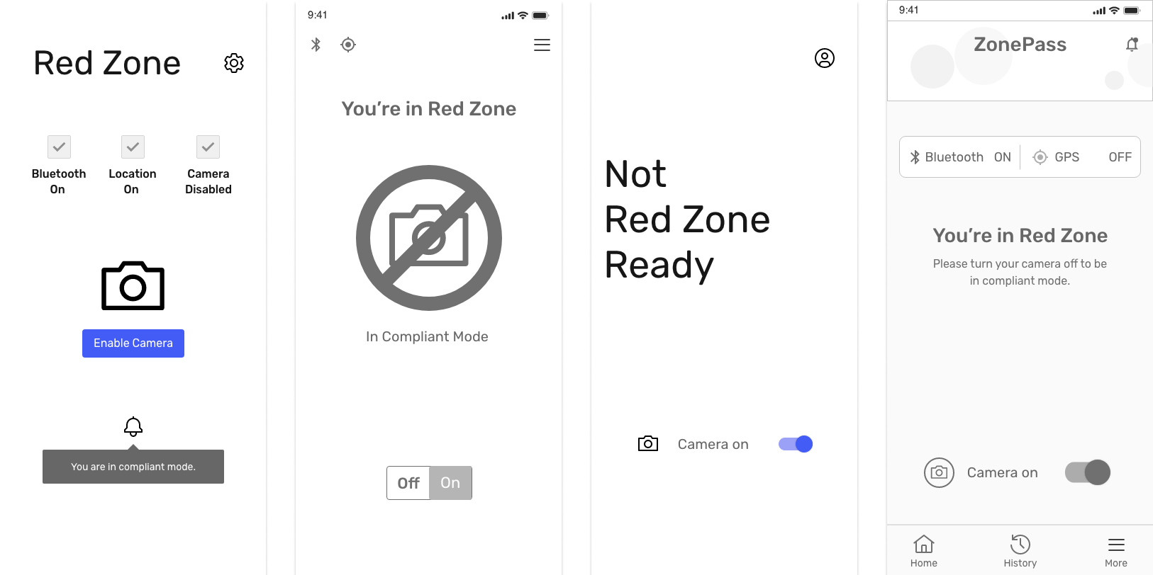The product is a native mobile app that enables users to disable their phone camera before entering restricted areas (Red Zones).